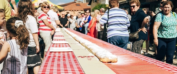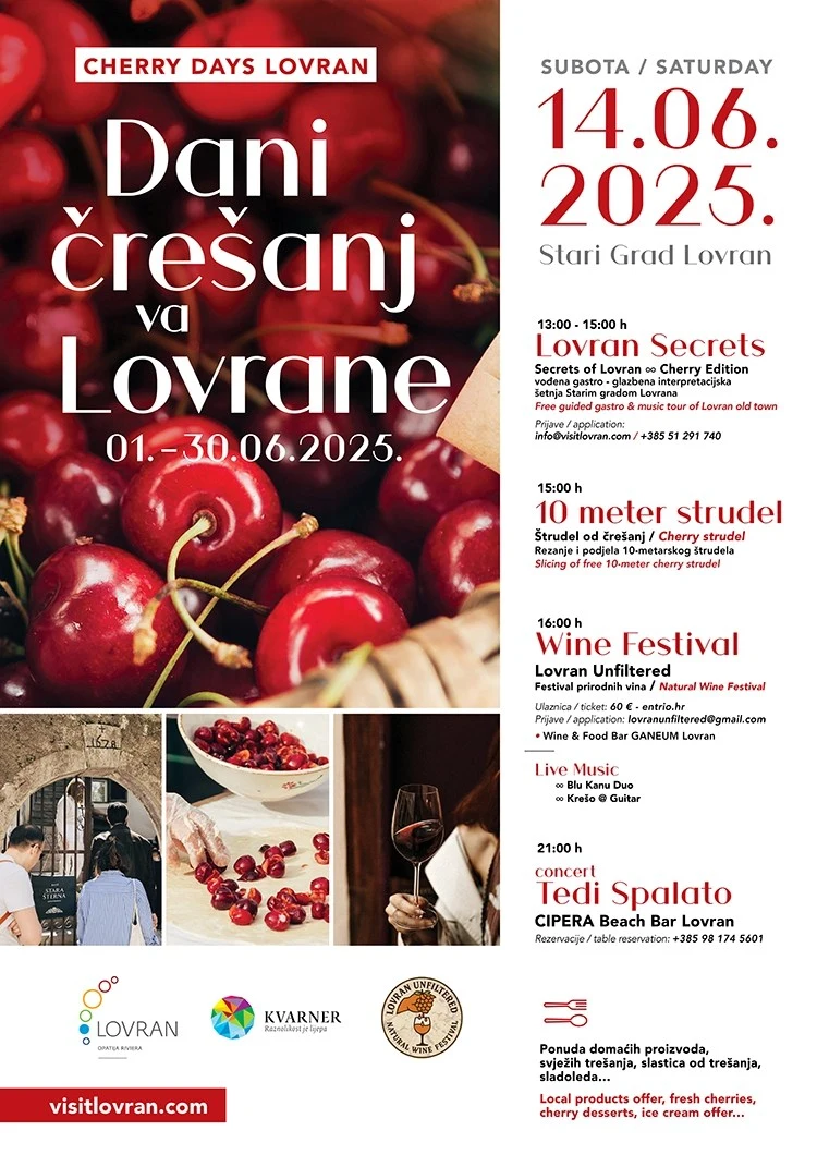 U 15:00 sati tradicionalno će se rezati 10 – metarski štrudel od trešanja koji će vrijedno spremiti slastičarke i slastičari hotela Excelsior u Lovranu a koji će se podijeliti svim zainteresiranima koji se u tom trenutku nađu na Trgu sv. Jurja.