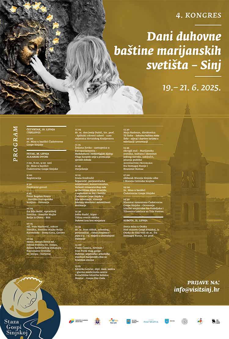Stoga je Sinj idealno mjesto za održavanje kongresa pod imenom Dani duhovne baštine marijanskih svetišta. Kongres će se održavati od 20. do 21. lipnja 2025. u organizaciji Turističke zajednice grada Sinja i Svetišta Gospe Sinjske te uz podršku Splitsko-dalmatinske županije, Turističke zajednice Splitsko-dalmatinske županije, Hrvatske turističke zajednice, Grada Sinja i Viteškog alkarskog društva.