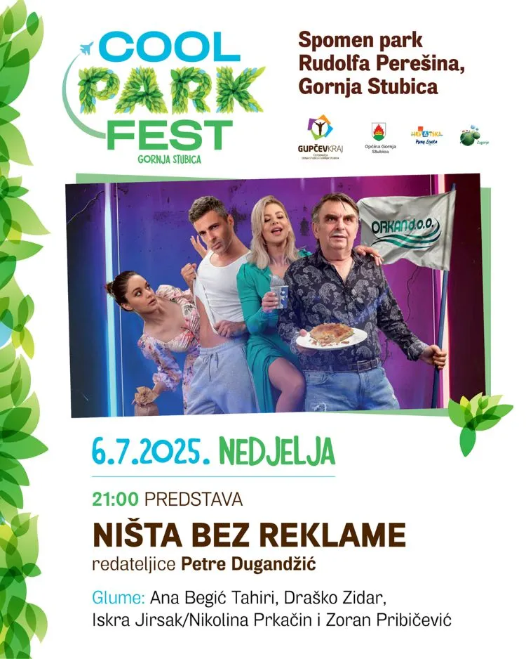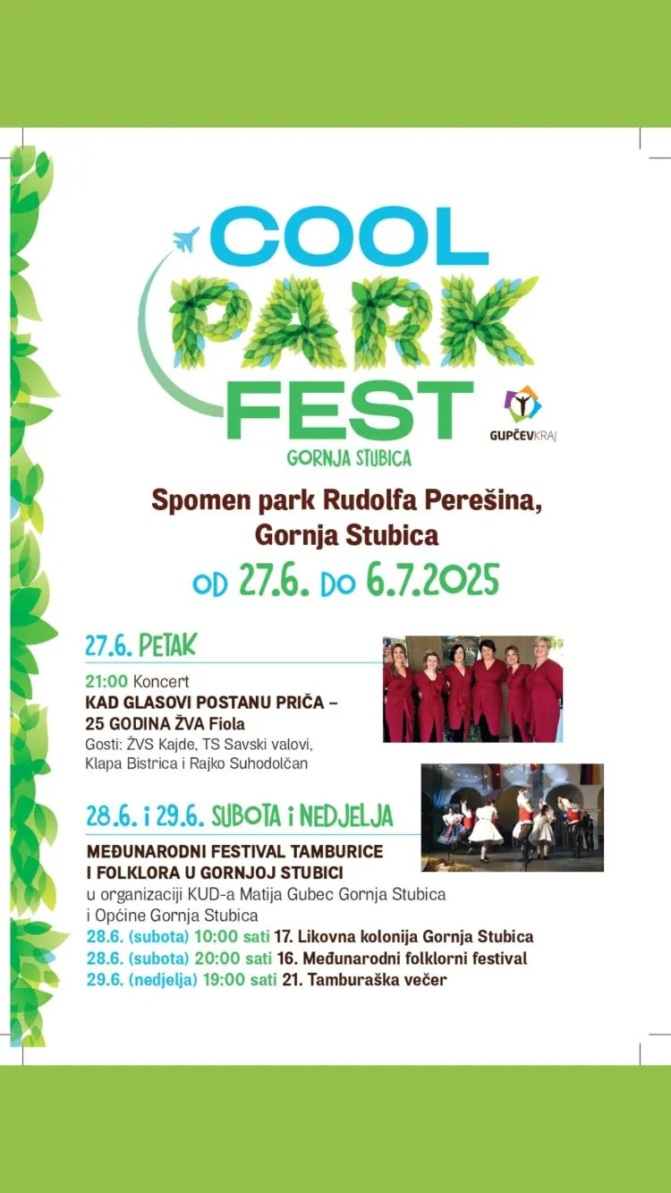 COOLturno ljeto u Gupčevom kraju se nastavlja! Nakon Stubica festa, manifestacije koja je u 3 dana okupila više od 20.000 posjetitelja, kreće novi kulturno zabavni doživljaj u Spomen parku Rudolfa Perešina u Gornjoj Stubici – COOL PARK FEST. Zbog radova i sanacije dvorca Oršić, festival Ljeto u dvorcu Oršić ide na kratku jednogodišnju pauzu. S toga, je TZ područja Gupčevog kraja, osmislila novi kulturni događaj, koji će se održati u neposrednoj blizini, a to je centar Gornje Stubice, tj. na lokaciji kod Spomen park Rudolfa Perešina. Park će postati idealno mjesto za druženje u Gupčevom zelenilu. To će biti guštanje u hrani i piću, koncertima, predstavi i dobroj zabavi.