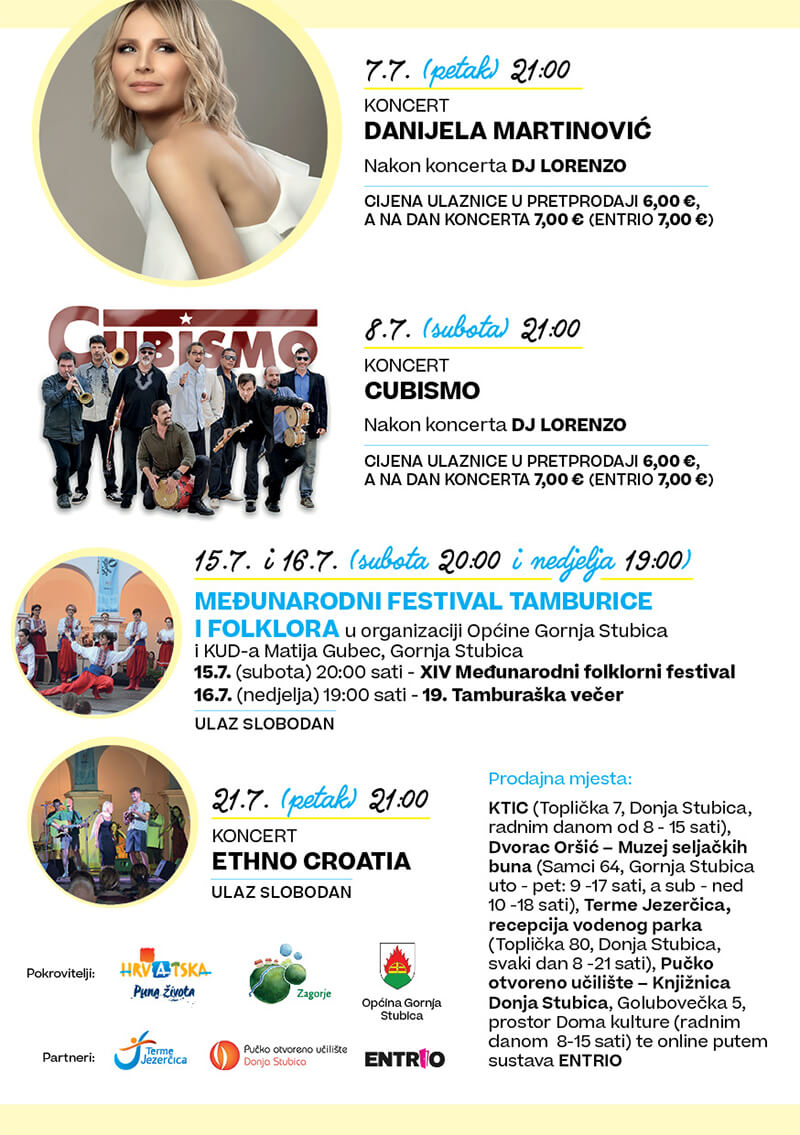 Od 30. lipnja do 21. srpnja bogat program: Ante Gelo Orkestar & vokalisti, Danijela Martinović, Cubismo, predstava, Ethno Croatia i Međunarodni festival tamburice i folklora uz odličnu gastro-turističku ponudu Gupčevog kraja