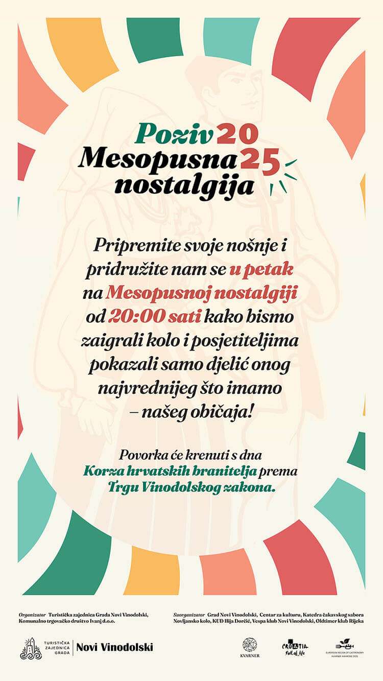 Mesopusna nostalgija spaja duh tradicije i energiju zabave, čuvajući ono najvažnije – naš identitet i zajedništvo. Vidimo se u Novom Vinodolskom na danima koji slave glazbu, ples i srce ovoga kraja!
