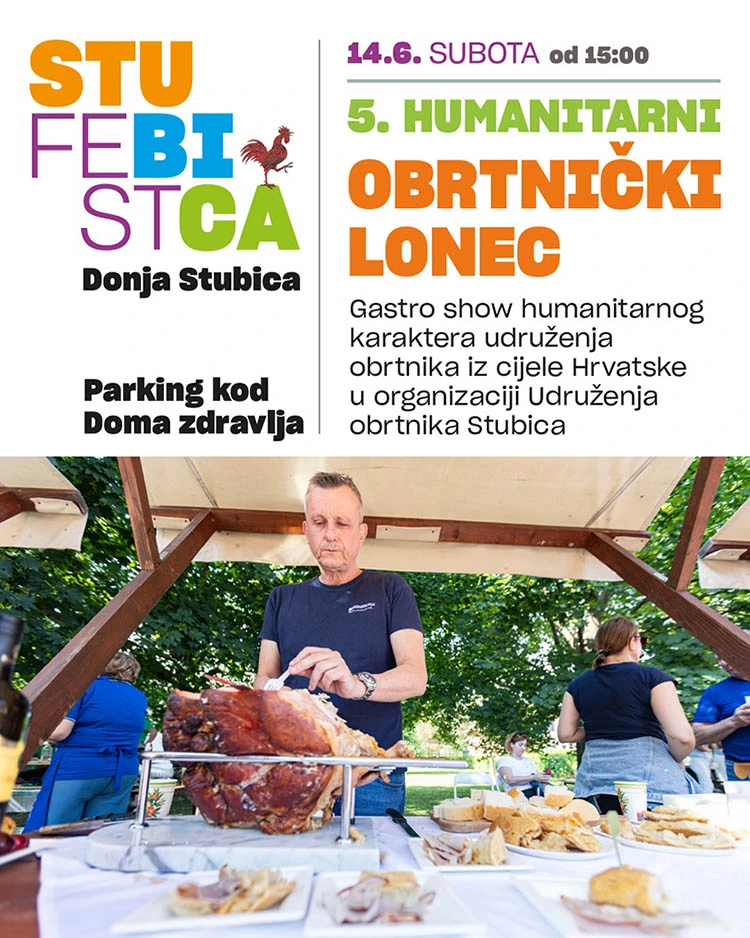 Za ljubitelje gastro ponude tu je 14.6.2025 u subotu od 15:00 sati i 5. HUMANITARNI OBRTNIČKI LONEC. Predstavnici udruženja obrtnika iz cijele Hrvatske, složeni u ekipe, predstaviti će svoju regiju autohtonom gastro ponudom po vlastitom izboru posjetiteljima manifestacije. Cjelokupni projekt ima humanitarni karakter prikupljanja potrebnih sredstava za sufinanciranje nabavke boljeg vozila radi poboljšanja mobilnosti nepokretnoj Petri Šobak kako bi joj se olakšao svakodnevni život. Ovaj gastro show nastao je u organizaciji Udruženja obrtnika Stubica.