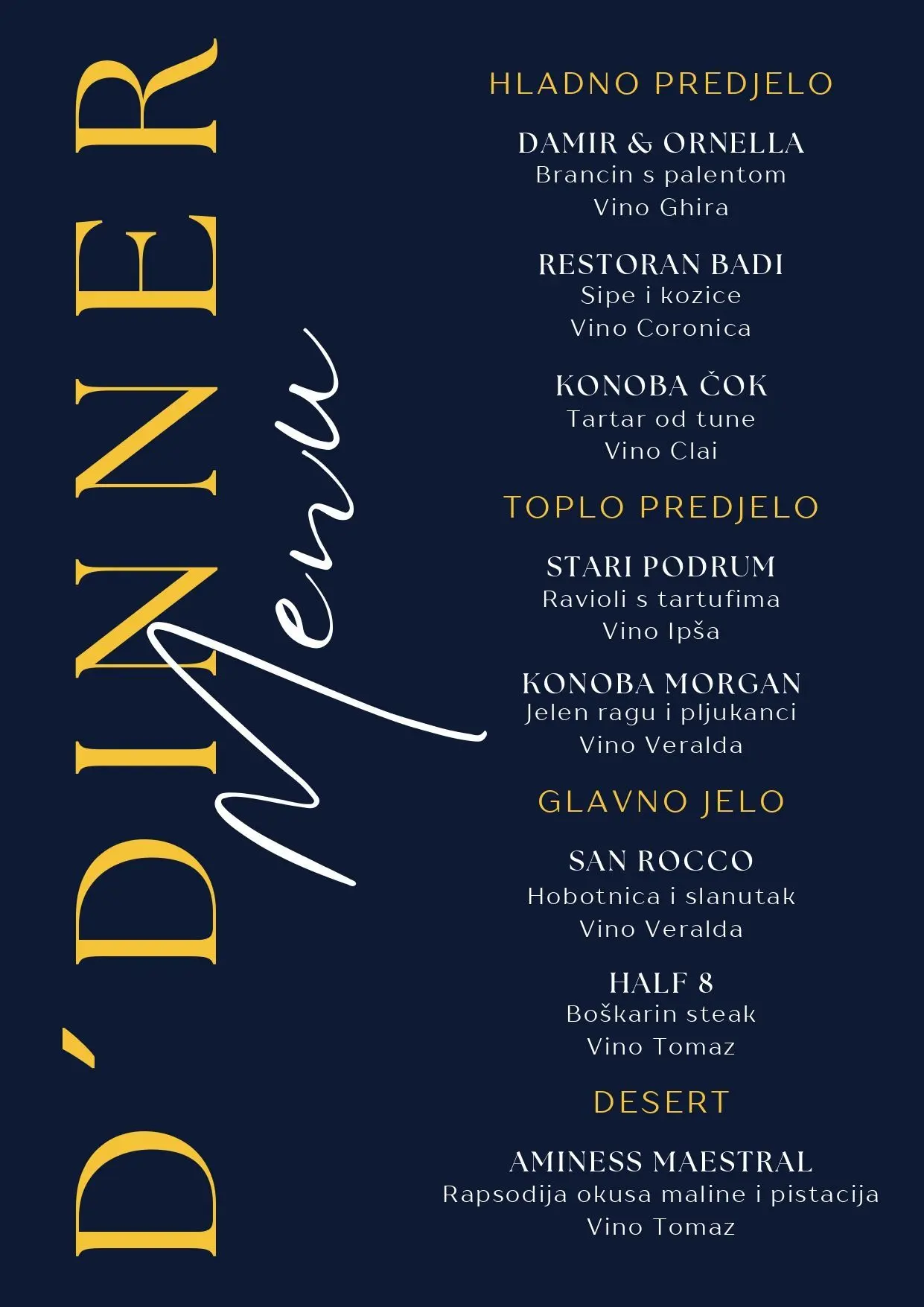 U jedinstvenom ambijentu nekadašnjeg impozantnog samostana u Dajli, okruženom ljepotama istarske prirode i zvukovima mora, očekuje vas gurmanska večera koja spaja najbolje od lokalne kuhinje i sofisticiranu atmosferu. Pridružite nam se i uživajte u delicijama koje potpisuju najpoznatiji restorani sjeverozapadne Istre: Badi, Čok, Damir & Ornella, Half 8, Morgan, San Rocco, Stari Podrum, Aminess Maestral Hotel. Svako jelo bit će pripremljeno od pomno odabranih lokalnih namirnica, s kreativnim prilozima i efektnim posluživanjem. Sve će biti pažljivo upareno s vrhunskim vinima i maslinovim uljima renomiranih istarskih vinara i maslinara, stvarajući savršen spoj okusa koji će zadovoljiti i najistančanija nepca.